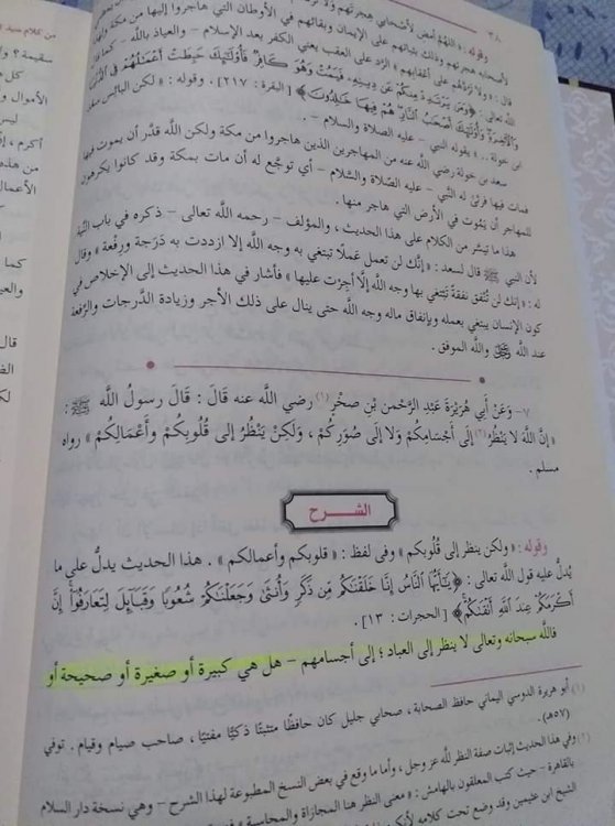 16. معني الاخلاص في اللغه: من خلُص أي صار خالصاً زال عنه شوبه و منه قول الله تعالي "نسقيكم مما في بطونها لبناً خالصاً.. في الشرع: هو افراد الله تعالي بالقصد في الطاعه و القصد اي تحديد وجهتك لله عز وجل الحديث: عن أبي هريرة عبد الرحمن بن صخر رضي الله عنه قال: قال رسول الله صل الله عليه وسلم:"إن الله لاينظر إلي أجسامكم ولا إلي صوركم و لكن ينظر إلى قلوبكم و أعمالكم " رواه مسلم. الشرح: إن الله لا ينظر إلي اجسام العباد هل هي صحيحه ام سقيمه كبيره او صغيرة و لا الي صورهم قبيحه ام جميله و لا إلي انسابهم و لكن ينظر إلي قلوبهم و نياتهم و ما تبعها من اعمال و هذا ما دل عليه قول الله تعالي « يا ايها الناس إنا خلقناكم من ذكر و أنثي و جعلناكم شعوباً و قبائل لتعارفوا إن اكرمكم عند الله اتقاكم» فوائدالحديث: ١- ان الاعمال بالنيات و ان القلوب هي التي عليها المدار فالواجب علي الانسان ان يصلح نيته و قلبه ٢- في الحديث دلاله علي ان اعظم وظيفه يقوم بها الانسان في الدنيا ان يعتني بإصلاح قلبه و تنقيه نفسه وان القلب يحتاج دائما للعلاج فكن دائما في غسيل لقلبك ٣- ان القلب و الاعمال محل نظر الرحمن و ليس بين الله و بين خلقه صله طيبه الا بالتقوي ٤- في الحديث اثبات صفه النظر لله تعالي "ان الله لا ينظر.. " ٥- في الحديث رد علي الجبريه بتفكيرهم ان العبد مُجبر علي اعماله، حيث ان الله اضاف العمل إلي عامله في قول النبي قلوبكم.. اعمالكم فلن يكون العمل الا علي قدره و اراده فاعله ٦-في الحديث رد أيضاً علي المُرجئه اللذين قالوا" ان الايمان هو مجرد الاقرار بالقلب و محل النظر الي القلب فلا داعي للأعمال من صلاه و صوم و..." فالحديث قرن صلاح القلب بالعمل و دل ان الايمان ما وقر في القلب و صدقه العمل ٧- حسن الباطن يعلو قُبح الظاهر والعكس ٨- دل الحديث ايضاً ان اعمال الجوارح تابعه لعمل القلب مصداق قول النبي صل الله عليه وسلم " ان في الجسد لمضغه اذا صلحت صلح الجسد كله الا و هي القلب"
