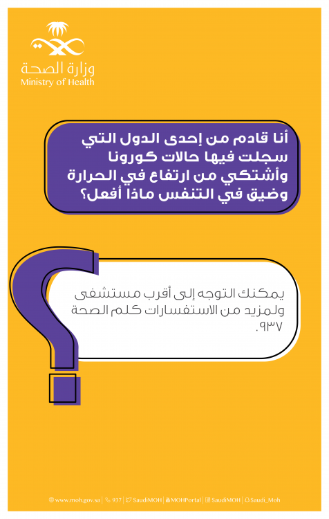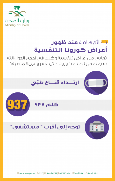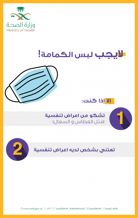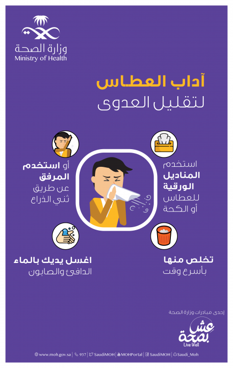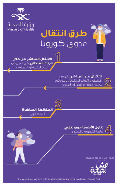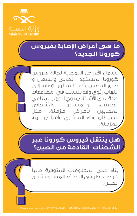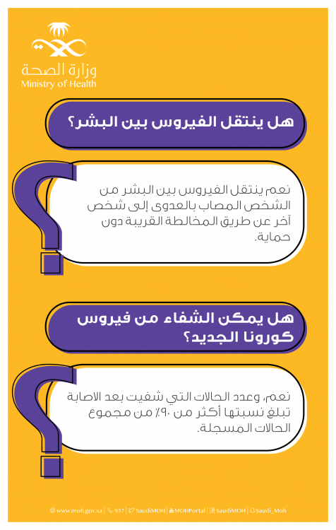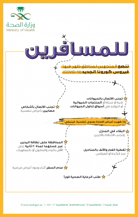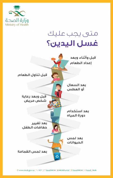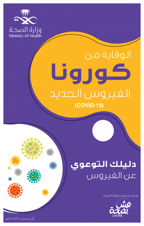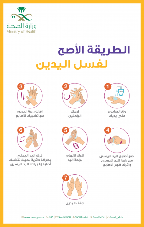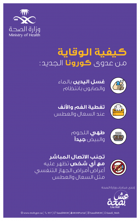 السلام عليكم ورحمة الله وبركاته كل ما يجب أن تعرفه عن فيروس كورونا الجديد دليل توعوي شامل أعدته وزارة الصحة السعودية طرق إنتقال العدوى - أعراض الإصابة - كيفية الوقاية - ونصائح هامة - وأسئلة وأجوبة بعد أن أعلنت منظمة الصحة العالمية أن انتشار COVID-19 وباء، بعد أن تجاوز عدد حالات الإصابة بالفيروس التاجي في جميع أنحاء العالم 156000 حالة في ما يقرب من 140 دولة ومنطقة، مع أكثر من 5800 حالة وفاة. اتبع التعليمات الوارده بالصور أدناه وأنشرها بين أهلك وأصدقاءك - كما يمكنك تنزيلها كملف PDF من المرفقات لا تبخل بنشر الموضوع للأصدقاء والأقارب لتعم الفائدة، ونسأل الله عز وجل أن يرفع البلاء والوباء من بلاد المسلمين وأن يحفظنا جميعاً بحفظه ورعايته وفضله، والحمد لله رب العالمين Corona-virus-prevention.pdf