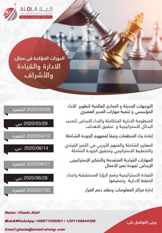 يتشرف مركز العلا للتدريب وتنظيم المؤتمرات بـ(سلطنةعمان) بتقديم احدث البرامج والدورات التدريبية المتخصصة و يضم المركز نخبة من المدربين المتميزين يمكنك في خمسة ايام أن تحقق حلمك نحو ذلك بأن تصبح وبشهادة رسمية مصدقة من وزارة القوى العاملة مؤهلا للعمل من خلال البرنامج المتميز *خصم خاص للمجمـوعات والهيئات الحكومية والمؤسسات الخاصة* للاستفسار عن (المحتوي العلمي-التكلفة -مواعيد الانعقاد) يمكنكم التواصل من خلال Name: أ/ غادة العلي Mob/ Whats App: OMN / 0096871556061 EGY/ 00201149844498 Email: ghada@alolatraining.com دورة المنظومة الادارية المتكاملة والاداء الابداعي لتحديد البدائل الاستراتيجية وتحقيق الاهداف ويوجد لدينا مجالات اخري (الهندسة – المحاسبة-البيئة وسلامة الاغذية- التسويق والمبيعات-الجودة والانتاج- الحوكمة وادارةالاستثمار-الدفاع المدني ومكافحة الحرائق-السفن وادارة الموانئ-السلامة والصحة المهنية-الصحافة والاعلام ومجالات اخري...) • تعقد برامجنا لمدة ( 5 ايام – 10 ايام – 3 اسابيع – شهر – 6 اشهر ). • وتعقد ايضا في ارقي القاعات الفندقية حول العالم دبي /ماليزيا /تركيا /الاردن / الاسكندرية /نيويورك / واشنطن / مدريد / برشلونة / المغرب / السعودية /سلطنة عمان/ قطر /شرم الشيخ / اندونيسيا / الصين / روسيا جاكرتا ويمكننا عقد الدورات حسب التاريخ والدولة المناسبة لسيادتكم ايضا •بالاضافة الي شهادة كامبريدج. للاستفسار علي المحتويات العلمية للبرامج او الاتفاق مع المركز من خلال Name : أ/ غادة العلي Mob / Whats App: OMN/0096871556061 EGY/ 00201149844498 Email: ghada@alolatraining.com