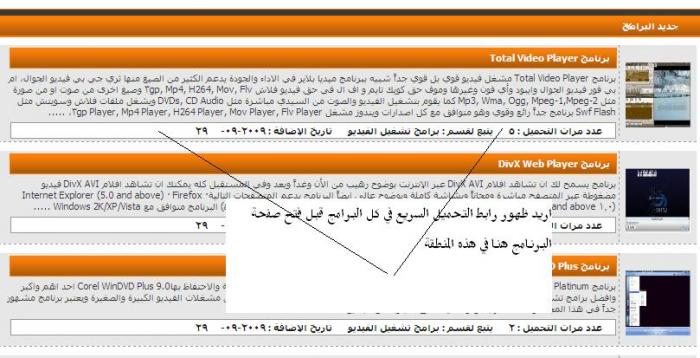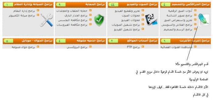 الســلام عليكم ورحمة الله وبركاته لدي بعض التعديلات التي اريد ان اعملها على سكربت مكتبة البرامج الذكية واريد ان اعرف الطريقة وهي كالتالي 1- الأقسام في الصفحة الرئيسية تعرض داخلها خمسة اقسام فرعية واذا اضفت اكثر من خمسة اقسام لا تظهر إلا عند فتح القسم الرئيسي أريد ان أجعل القسم يعرض اكثر من خمسة اقسام داخله في الصفحة الرئيسية مثال للتوضيح 2- عندما اقوم بفتح قسم رئيسي تظهر داخله الاقسام الفرعية فقط اريد ان تظهر الأقسام الفرعية وايضا تظهر تحتها البرامج داخل هذه الاقسام الفرعية كما في الصفحة الرئيسية لسرعة الوصول للبرامج قبل التفكير بدخول القسم الفرعي ( مثال ) مثال آخر يوضح ظهورا لبرامج في الرئيسية تحت الاقسام 3- أريد أن يظهر تحميل سريع للبرنامج قبل الدخول لصفحة البرنامج يكون الرابط هنا مثال يظهر في المكان المؤشر إليه بالسهمين اي واحد منهم عادي المهم نفس المنطقة 4- هل هناك إمكانية استطيع من خلالها إظهار الاقسام الفرعية تحت الاقسام الرئيسية في قائمة الاقسام الرئيسية على يمين الصفحة اتمنى أن أجد حلول لهذه الاستفسارات في أقرب وقت ممكن شاكرين لكم حسن تعاونكم معنا وما تبذلوه من أجل انجاح هذا الاسكربت المتميز صراحه
