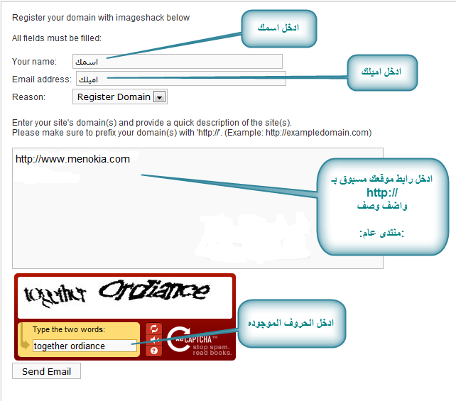 السلام عليكم ورحمة الله وبركاته بعد بحث طويل جداً عن مشكلة عدم ظهور الصور المرفوعة على موقع ImageShack كان الحل للوهلة الأولى أن كل واحد عاوز يشوف الصور فى أى موقع أو منتدى يعمل أكونت على موقع الإيميج شيك ومن ساعة تقريباً كنت ببحث عن كبر أبعاد المشكلة فلقيت الحل الجميل جداً وممكن يكون حل أيسر وأحسن والحل ده متعلق بأصحاب المواقع والمنتديات وليس الأعضاء أو الأفراد العاديين جمعنا الحل فى شكل صور وفيديوهات من مصدرين طبعاً ده المنظر اللى بيظهر للجميع لما يجى يشوف صورة مرفوعة على الايميج شيك هتدخل على الرابط ده http://stream.images...register_domain وتسجل دومين موقعك ولما تظهرلك الرسالة دى تعرف أن العملية تمت بنجاح بعون الله بعد كدا انتظر عدة ساعات لحين يتم فحص موقعك ودومينك للأمانة العملية الحل ده منقول من موقع نوكيا الشرق الأوسط ====================================== عاوز شرح الفيديو ,,, اتفضل اتفرج http://www.youtube.com/watch?v=t25z76rCje8&feature=player_embedded http://www.youtube.com/watch?v=8ZQaeYk-PT8&feature=player_embedded منقول عن موقع افهم كمبيوتر ======================================= فى بعض المعلومات بتقول أن موقع ايميج شيك تراجع عن أسلوب تسجيل الدومين من يومين ,,, الله أعلم بصحة الخبر ده ,,, بس الواقع دلوقتى بيقول أن فى صور فى بعض المواقع والمنتديات مش بتظهر ======================================= بالنسبة للأعضاء العاديين ,,, لو بتواجهك مشكلة فى رؤية الصور المرفوعة على الإيميج شيك فى أى موقع أو منتدى ,,, كل اللى عليك إنك تسجل عضوية مجانية على الموقع وبعد كدا كل الصور فى كل المواقع والمنتديات هتشوفها بشكل طبيعى جداً جداً ======================================= شكراً لكل من ساعد فى حل المشكلة تم تجميع الحلول من أكتر من مصدر عن طريق أخوكم فى الله Dr.A7MD تحياتى ليكم