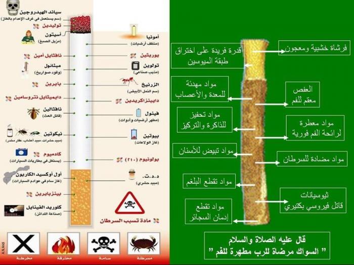 هذه الصورة مقارنة بين السواك و السيجارة .. إقرأ تركيبة كل واحدة فيهما بالتفصيل .. وعليك الاختيار .. يا من تدخن إتق الله في صحتك وفي مالك ؟؟ أين العزيمة ؟ أين الإرادة ؟ أنت تلقي بنفسك إلى التهلكة .. تصرف أموالك في دخاااااان .. وإخوانك مرضى بالسرطان ولا يجدون أموال .. أخوانك فقراء لا يجدون لقمة العيش .. أمانة الصحة منحك الله إياها وأنت لا تحافظ عليها . انظر الصورة جيدا وقارن .. لكن للعلم .. إذا إخترت السوال فأنت عبد الله عز وجل ومن أحباب رسول الله صلي الله عليه وسلم .. وإذا اخترت السيجارة فأنت أصبحت عبداً للسيجارة واتبعت الشيطان الرجيم والعياذ بالله .. فما من مسلم إلا ولديه عزيمة قوية ..