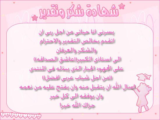 5. ندى شكرا يا جميل على الرد عاشق الصداقه يشرفنى ان ترد على موضوعى جزاك الله كل خير وزادك من فضله وحقق لك كل ما تتمنى رجل من الصحراء اخى الكبير اشكرك من اعماقى على الرد الجميل زاد موضوعى شرفا ردك عليه اسال الله ان يفرج همك ويرزقك من حيث لاتحتسب